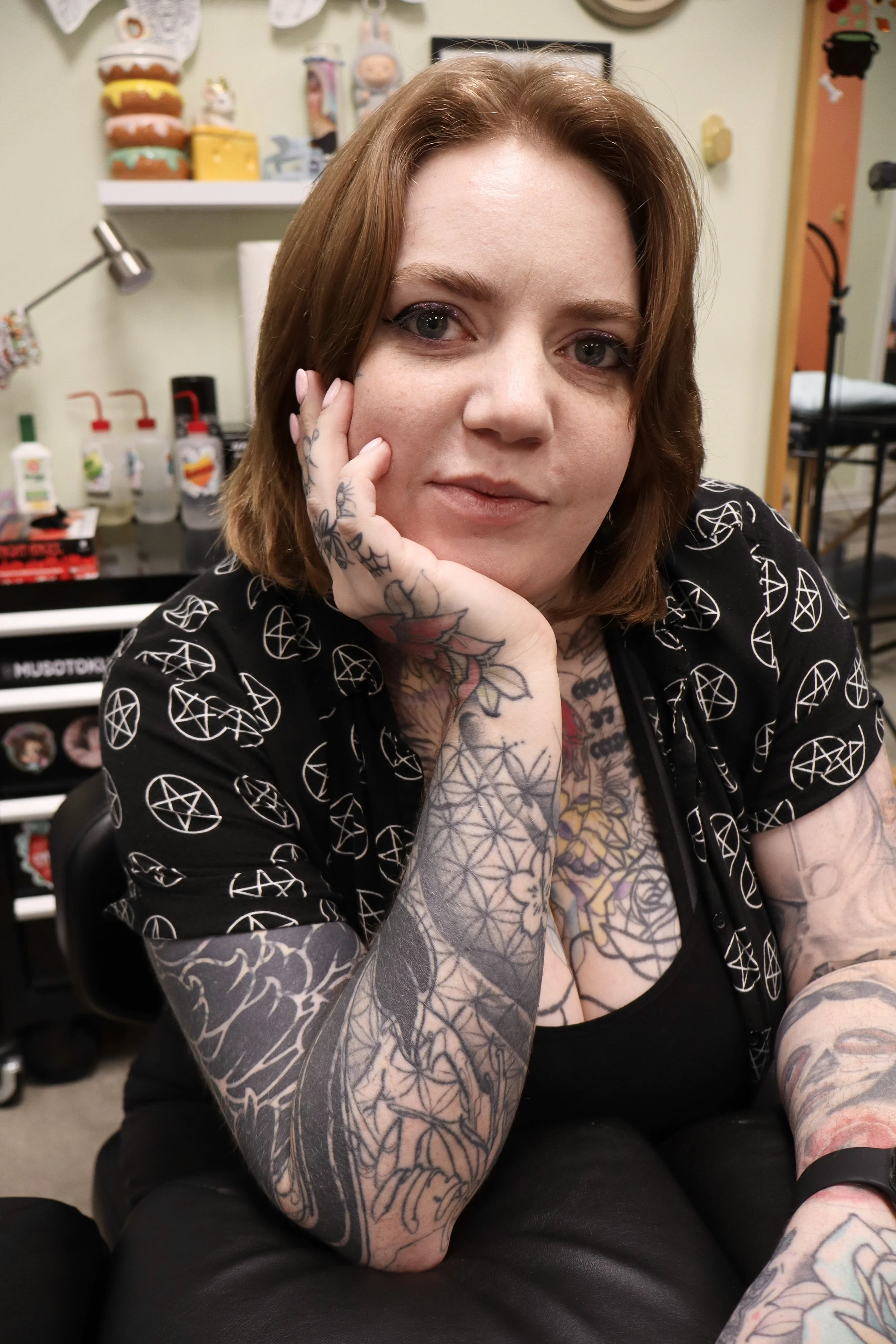 Born and raised in Gainesville, Georgia, Eri has been making art since she could hold a pencil—thanks to her grandma’s kitchen table lessons. She's been tattooing for over a decade now, with a soft spot for florals, neo-traditional, blackwork ornamentals, and anything pretty and girly. When she's not tattooing, you’ll find her reading, crocheting, gaming, cuddling with her dogs, Stanlee and Tucker, or kissing her cats, Schnapps and Jellybean, on their little foreheads.