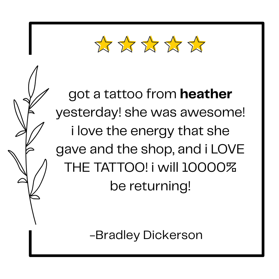 Starting her tattooing career in 2017, Heather specializes in illustrative black work, dot work, and black and grey. She loves creating a wide variety of tattoos, but especially enjoys botanical illustrations and small critters. Heather is down to earth, kind-hearted, and has a great sense of humor. While sitting with Heather, you’re likely to have a few laughs. She is a self-described “silly goose”. In her free time, she loves to binge watch reality TV with her dogs, Susan and Tina, obsess over her guinea pigs, roller skate, and be annoying.