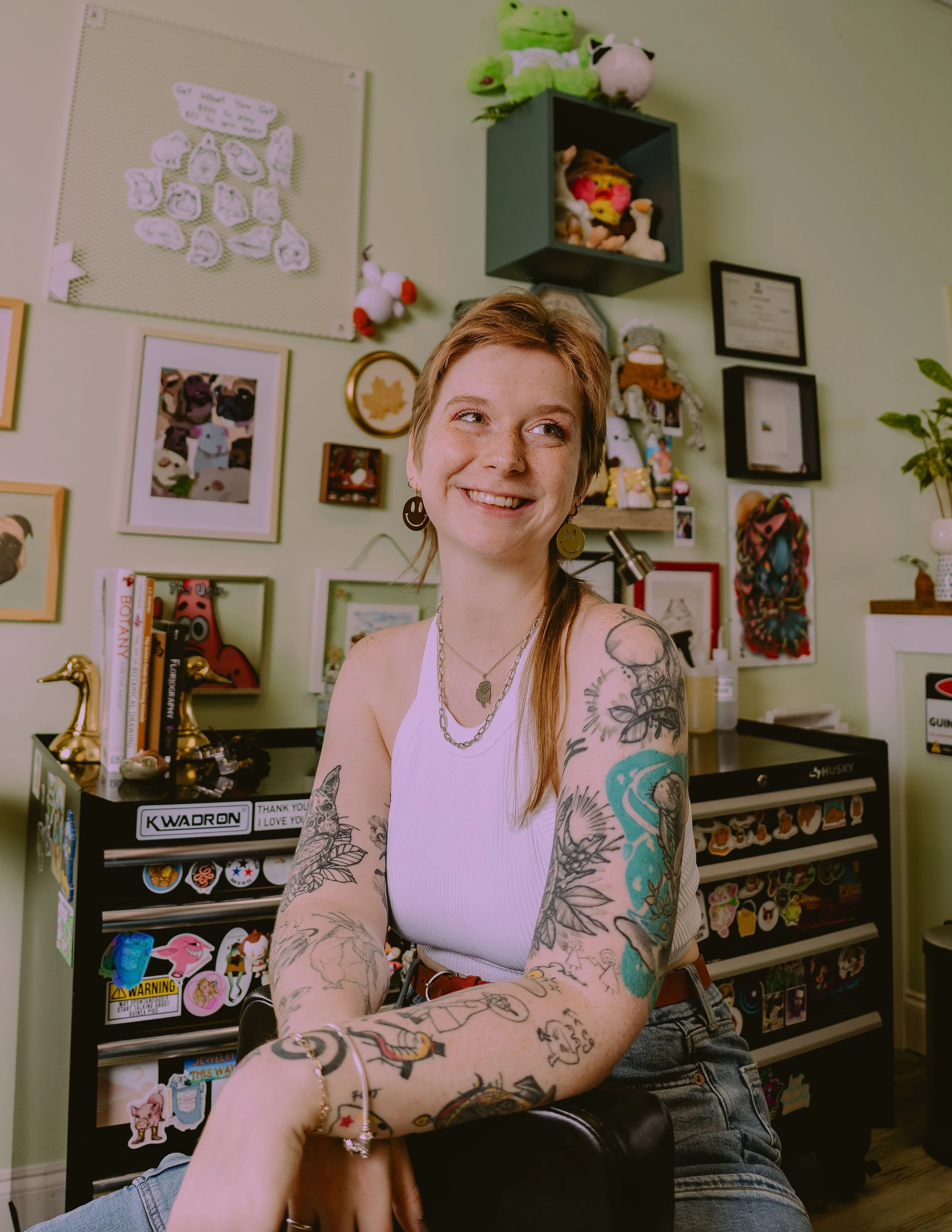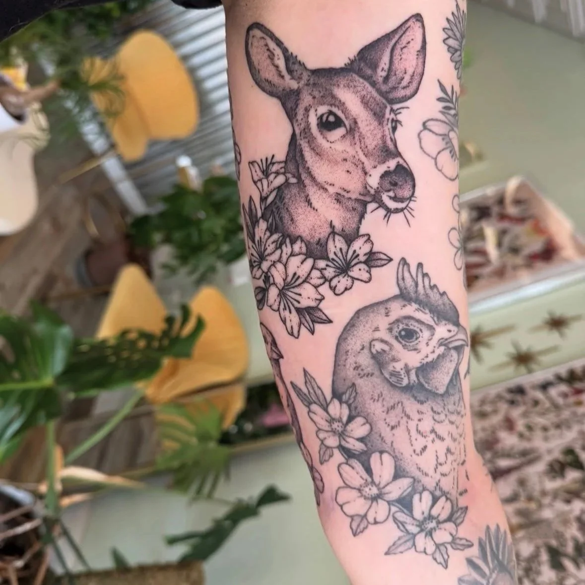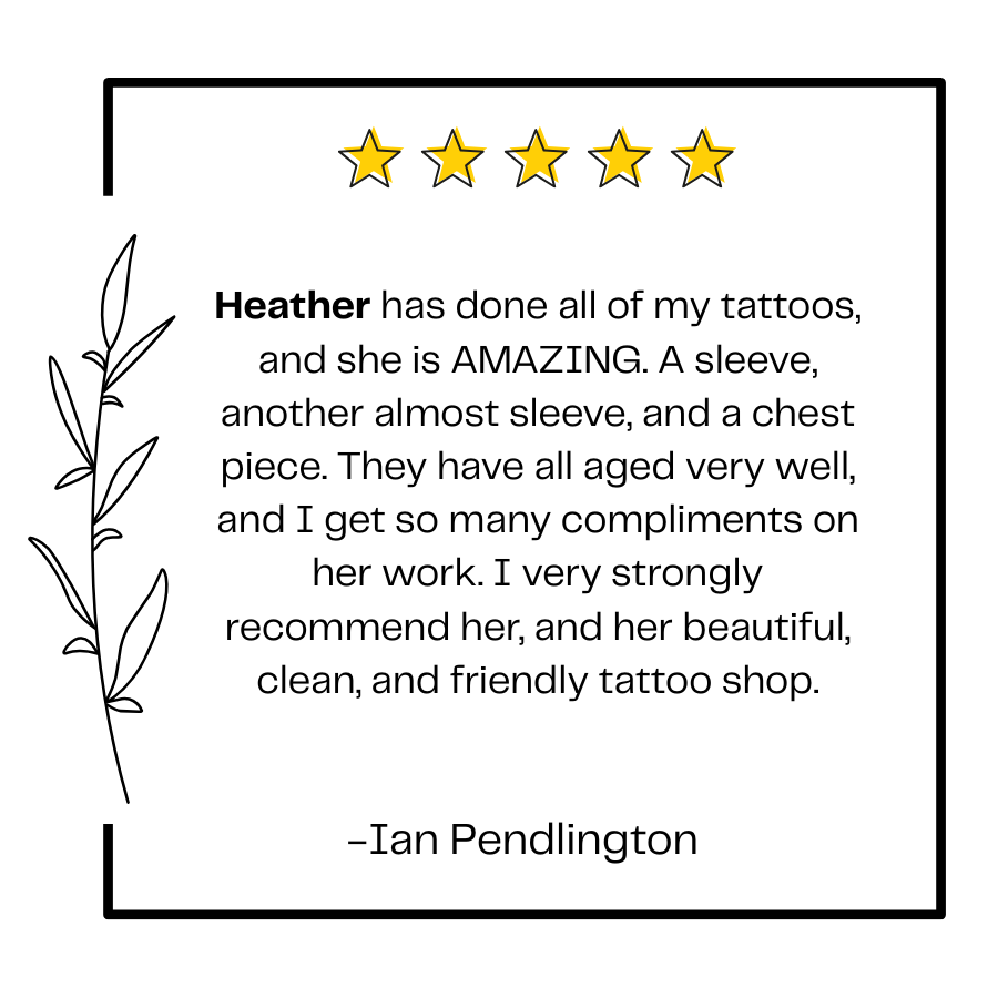 Starting her tattooing career in 2017, Heather specializes in illustrative black work, dot work, and black and grey. She loves creating a wide variety of tattoos, but especially enjoys botanical illustrations and small critters. Heather is down to earth, kind-hearted, and has a great sense of humor. While sitting with Heather, you’re likely to have a few laughs. She is a self-described “silly goose”. In her free time, she loves to binge watch reality TV with her dogs, Susan and Lunch Lady, obsess over her guinea pigs, roller skate, and be annoying.