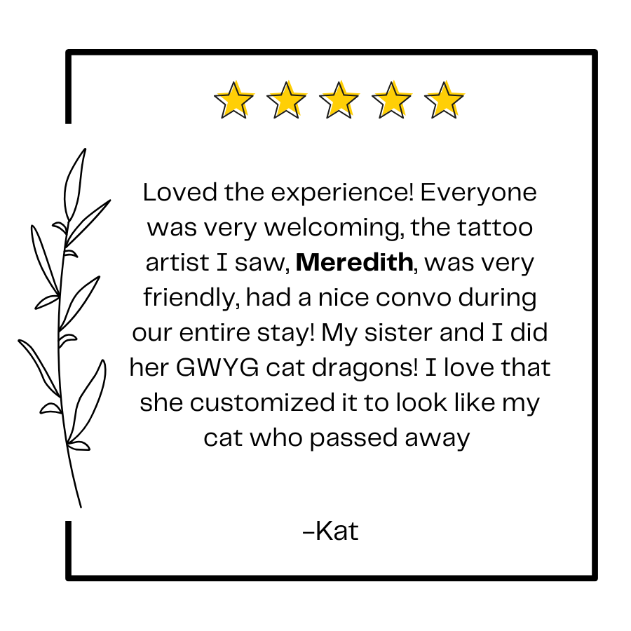 Known for her fun and welcoming chatty energy, Meredith makes every session an enjoyable and creative experience. When she's not tattooing, she's likely reading, playing D&D, spending time with her partner, spoiling her cats Albus and Moose, crafting, or watching the latest vampire movie.