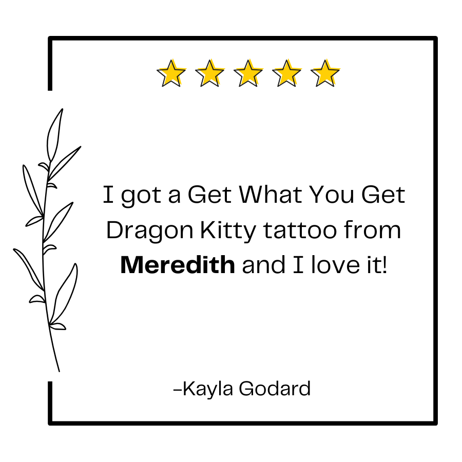 Meredith started out in the tattoo industry in 2014 and specializes in new school, American traditional, and illustrative tattoo styles. She loves bringing colorful, bold, dynamic designs to life, especially when they're inspired by animals, characters, or pop culture like music, books, movies, and comic books.